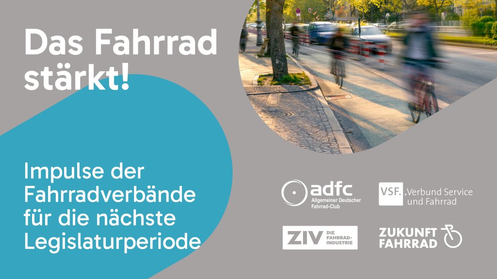 Der Allgemeine Deutsche Fahrrad-Club (ADFC) und die Fahrradwirtschaftsverbände Verbund Service und Fahrrad (VSF), ZIV – Die Fahrradindustrie und Zukunft Fahrrad fordern in ihrem gemeinsamen Impulspapier „Das Fahrrad stärkt!“ entschlossene politische Maßnahmen, um das Fahrrad in der Wirtschafts- und Verkehrspolitik der neuen Bundesregierung fest zu verankern. Die zentralen Anliegen der Verbände: den Fahrradwirtschaftsstandort Deutschland stärken und die vielfältigen Potenziale des Radverkehrs ausschöpfen.