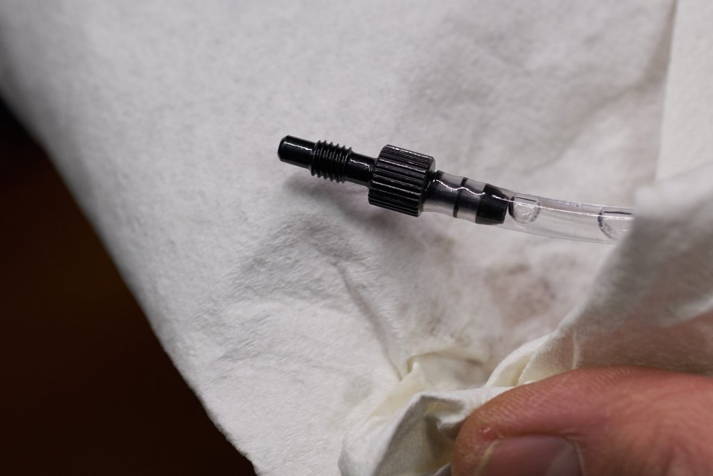 Der Adapter wird auf die Spritze aufgesetzt und an die Getriebeöffnung geschraubt.https://www.pd-f.deImpressum / Imprint: pressedienst-fahrrad, Gunnar Fehlau, Ortelsburger Str. 7, 37083 Göttingen, Germany, T: 0049(0)551/5031545, M: 0049(0)171/4155331, F: 0049(0)551/5031457, gf@pd-f.de, www.pd-f.de Quelle/Source [´www.pd-f.de / Arne Bischoff´]