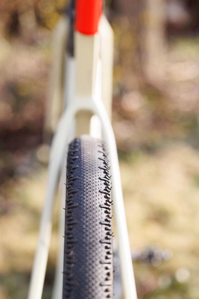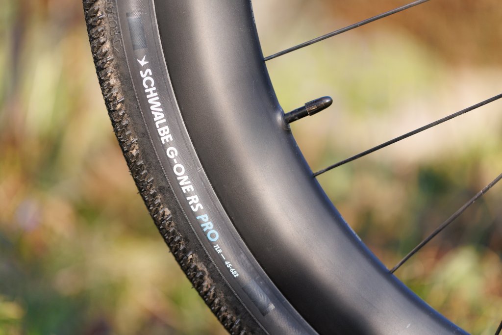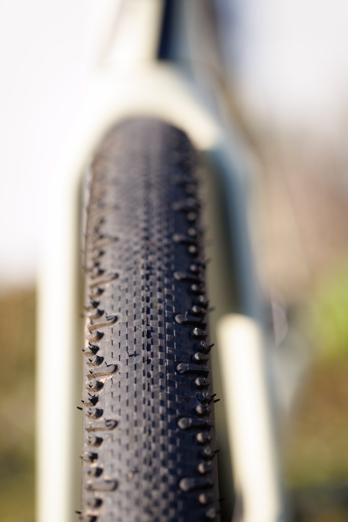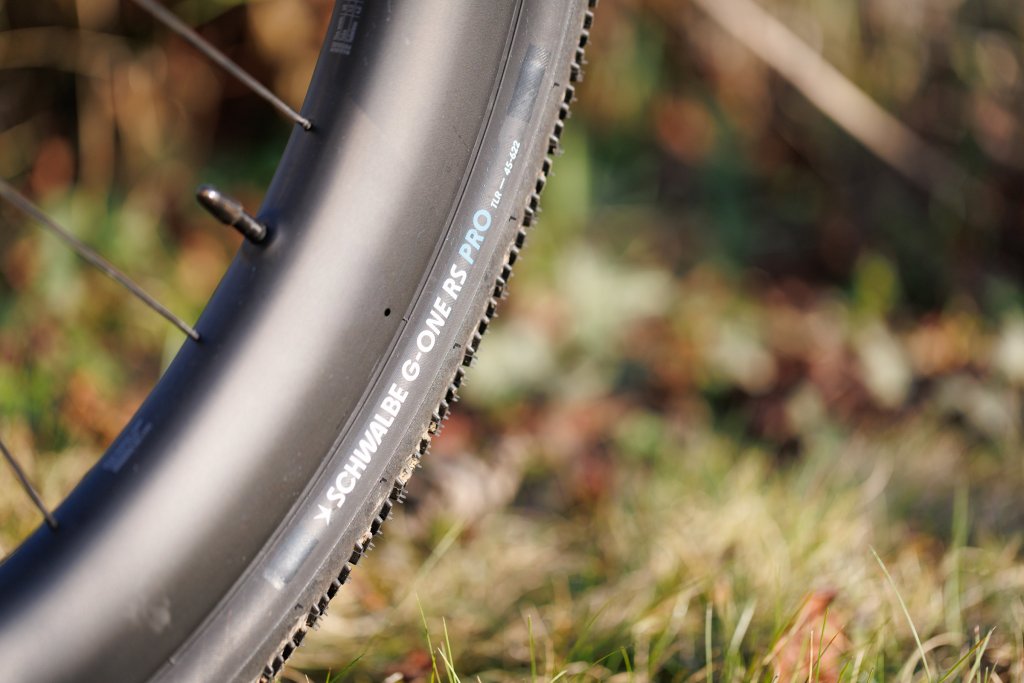 Und das merke ich! Der Reifen ist einfach sauschnell und wichtiger noch, passt perfekt zu meinem Nutzungsprofil. Trails und kinderkopfgroßen Grobschotter fahr ich mit dem Gravelbike ohnehin nicht. Auf Schotterstraßen und Feldwegen reicht mir das Minimalprofil des G‑One RS Pro gut aus. Wenn es zwischen zwei Gravel-Abschnitten über (oft miserablen) Asphalt kleinster Nebenstraßen und Wirtschaftswege geht, schlägt so richtig seine Stunde. Fast so schnell wie ein Rennradreifen, aber mehr Pannenschutz und Traktion. Für mich der perfekte Reifen für Race-Gravelbikes (und Schlechtwegerennräder). Auch beim Kurvenverhalten überzeugt mich der Reifen. Ausgeprägte Schulterstollen und ihr Lenkverhalten sind für eingeschworene Roadies im Vergleich zu Slicks oft gewöhnungsbedürftig. Ich komme vom MTB und bin den Übergang zu den Schulterstollen bei Bike-Schräglage gewöhnt – wer das Rad aktiv in die Kurve drückt, wird mit sehr berechenbarem Fahrverhalten belohnt.