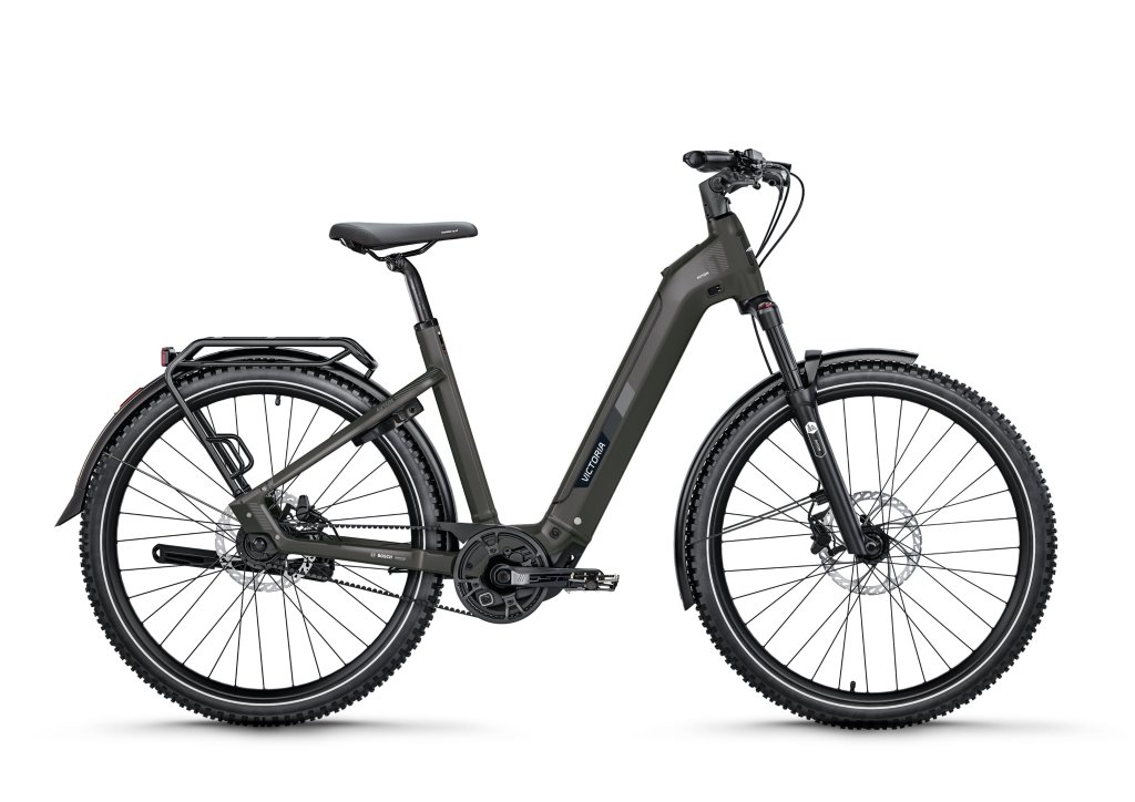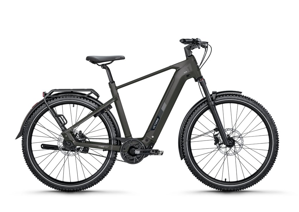 Hersteller Victoria hat sein Modell„Avyon 11“ mit dem Antrieb Performance Line CX und einem PowerTube-800-Akku, beides von Bosch, ausgestattet und bietet damit ein klassisches SUV-E-Bike. Sprich: Es eignet sich sowohl gut für lange Touren über Feld‑, Wald- und Wiesenwege bis hin zu städtischen Pendelstrecken. Die Kombination aus 3x3-Nine-Getriebenabe und Gates-Riemen sorgt für einen wartungsarmen Antrieb und eine Übersetzungsbandbreite von 554 Prozent.