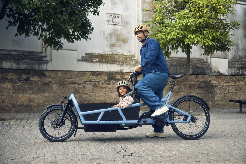 Mit dem „Load 5 75“ präsentiert Riese & Müller ein vollgefedertes Cargobike mit hoher Fahrdynamik. Die große Ladefläche ermöglicht den Transport des Wocheneinkaufs oder bietet Platz für bis zu drei Kinder bzw. einen Hund. Dank tiefem Schwerpunkt und Vollfederung ist man auch bei hoher Beladung auf holprigen Untergründen sicher unterwegs. Ein weiteres Sicherheits-Feature ist das optional erhältliche Integral Braking System (IBS). Dieses optimiert die Bremskraft zwischen Vorder- und Hinterradbremse. Riese & Müller bietet das Load 5 in unterschiedlichen Ausstattungsvarianten an. Neben verschiedenen Schaltungsvarianten von Kettenschaltung bis Rohloff-Getriebenabe sind auch unterschiedliche Bosch-Motoren wählbar. So findet man je nach Fahrstil das passende Bike. Der Aluminiumrahmen besteht darüber hinaus zu 25 Prozent aus recyceltem Aluminium. Der Preis beginnt ab 7.649 Euro.